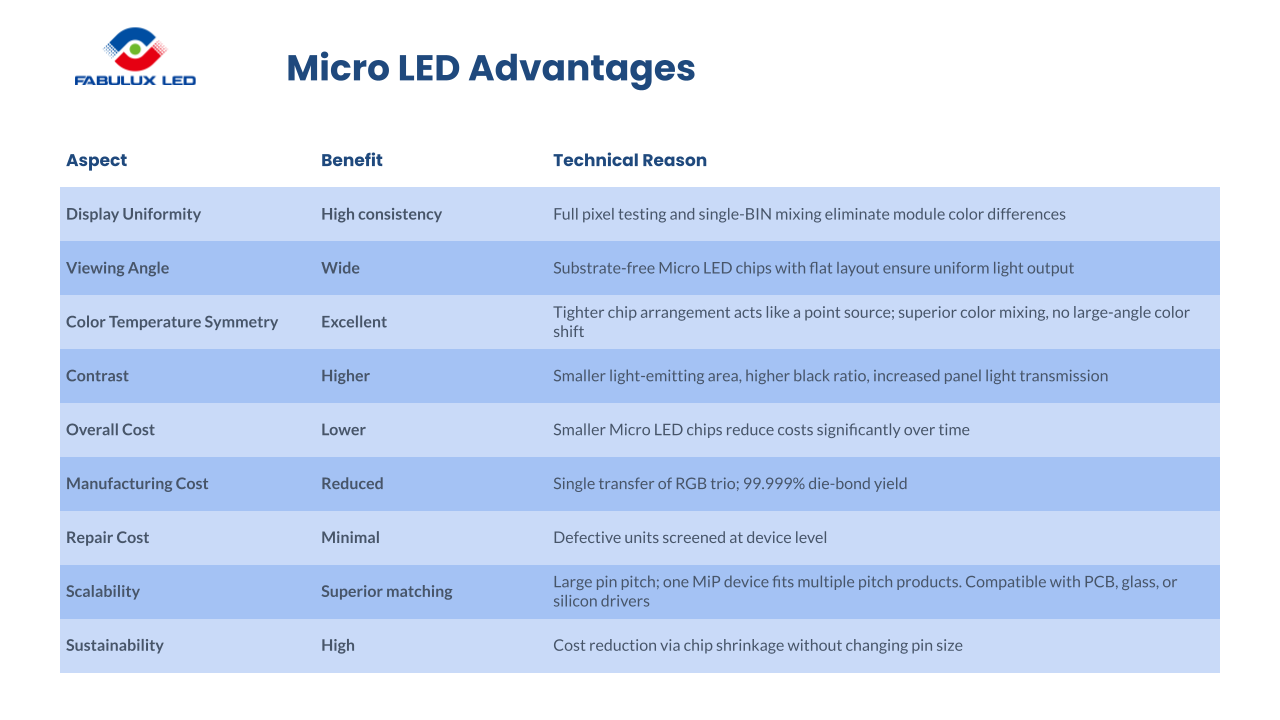 MiP leverages highly efficient mass transfer equipment, where efficiency increases as chip size decreases. This process simultaneously bonds all three RGB chips in a single step, achieving near-perfect yield. The use of smaller chips enables tighter pixel pitches, more compact form factors, and reduced material consumption. Furthermore, MiP is positioned for a sharp decline in cost at scale, establishing a formidable foundation for long-term competitiveness.