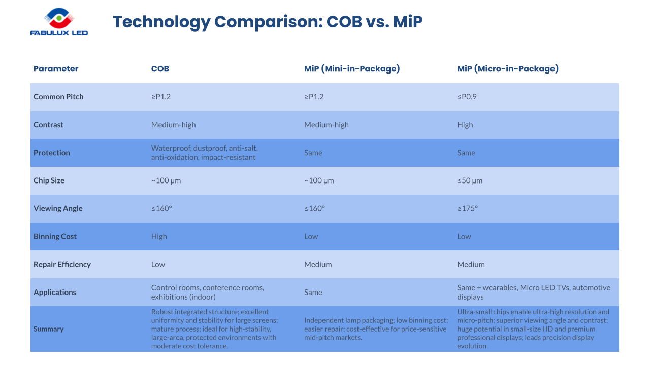 Conversely, COB (Chip-On-Board) represents a mature path for Mini LED. As a chip-level integration technology, it boosts stability by simplifying fine structures and creating a uniform "area" light source from discrete "points." The outcome is a trusted solution renowned for its ultra-high contrast, wide viewing angles, durability, and excellent heat dissipation. Now, let's consider the compelling value proposition of Micro technology, and the difference between COB, MiP(Micro-in-Package) and MiP (Mini-in-Package)